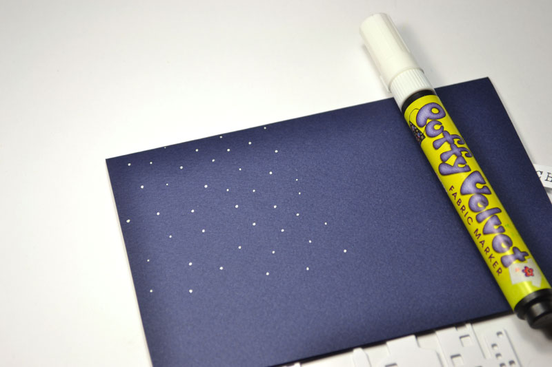 С помощью маркера с эффектом бархата Marvy Uchida — Puffy Velvet Fabric Marker нарисовала много маленьких снежинок. Они должны быть очень маленькими, так как при нагревании они станут более объемными.