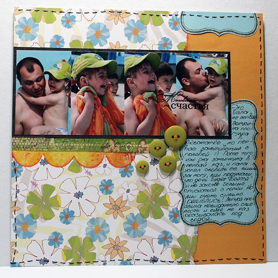 Для основы я использовала листы акварельной бумаги 21*21. Далее скрап бумага из набора «Scrappy Cat». Подложки для фото – Лист скрапбумаги Prima (темная сторона). Края тонировала чернилами ColorBox PetalPoint Classic Pigment Inkpad – «Pinwheel», еще всякие обрезочки от предыдущих работ. Листочки для журналинга я сделала при помощи штампа из набора «Making Memories» – «Journaling» Clear stamps, воспользовавшись приемом с маскировкой, я избавилась от завитушек и полосочек, сделав один только контур. Весь журналинг написала от руки черным линером. По краю сделала немного кривенькую ручную строчечку, т.е дырочки, я все-таки сделала машинкой, а вот строчку уже ручечками. И в конце пришила несколько пуговок.