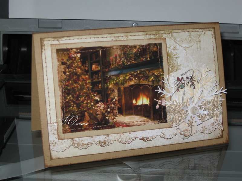 В этой открытке я использовала бумагу Webster's Pages на подложке, дополнительно отштамповала снежинками из наборчиков HA «Studio G», кусочек кружева и ленты, с пуговичкой-снежинкой Dress It Up и дырокольными еловыми веточками. Надпись распечатала на принтере, приклеила на подложку и привязала её шнурками. Елка из скрап бумаги, прошила по центру и нанесла точечки будто снежок, контуром по стеклу.Ну, и почти все элементы тонированы дисстресами — vintage photo. Следующая открытка тоже сделана с использованием бумаги из новогоднего набора Webster's Pages, задействован бордюрный дырокол Martha Stewart — Doily Lace Edge Craft Punchв виде ажурной ленты и затонирован дисстресом. Добавила кусочек кружева, веточки еловые и снежинку (дырокол PP — Snowflake ), прикрытую сверху мини-пуговкой Dress It Up. Картинка распечатана на фотобумаге, края потёрты при помощи классной штучки от Тима Хольца paper distressor и также затонирована дисстресом.