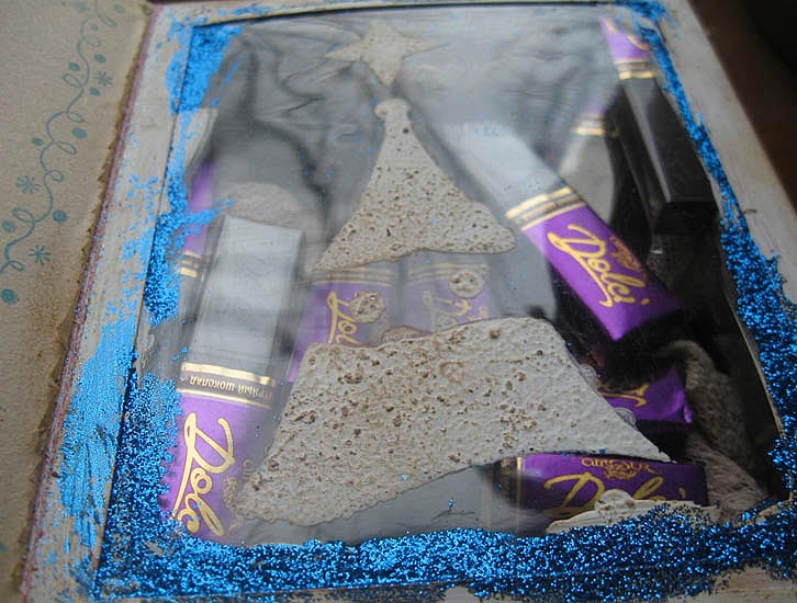 Внизу коробка украшена кашемировыми воротами, тоже затонироваными золотой краской.А внутри можно положить сладости, довольно много сладостей и не только их. Елка сделана по трафарету дистрессинговыми чернилами vintage photo.
