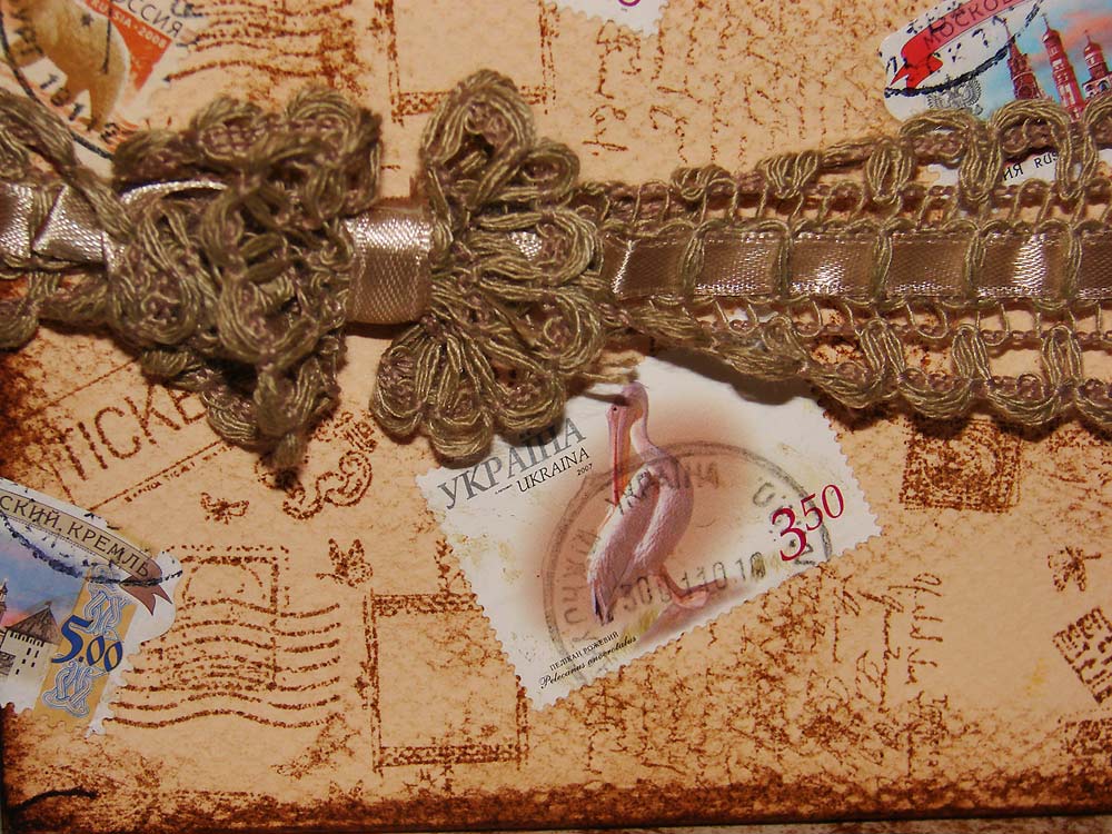 Начала я с малого – сделала коробочку для листов 15×15 см. Основа – это готовая коробка подходящего размера, обрезанная в нужную мне форму. Затем я обклеила ее бумагой для пастели, предварительно отштамповав на этой бумаге нужные мне мотивы – письмо (Post card) и почтовый коллаж (Post office) от Prima Marketing. Штамповала дистресс чернилами Ranger Distress Ink — vintage photo. Ими же все и затонировала, в том числе и внутри коробки. Затем наклеила марки, которые накопились у меня от скраповой переписки)))) Повязала ленту – и коробочка готова!