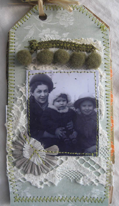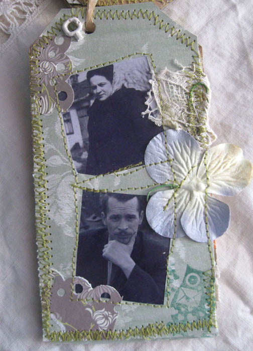 с обратной стороны тегов пристрачивала остатки бумаги, кружево и листики из польской книги, бабушка у нас полька