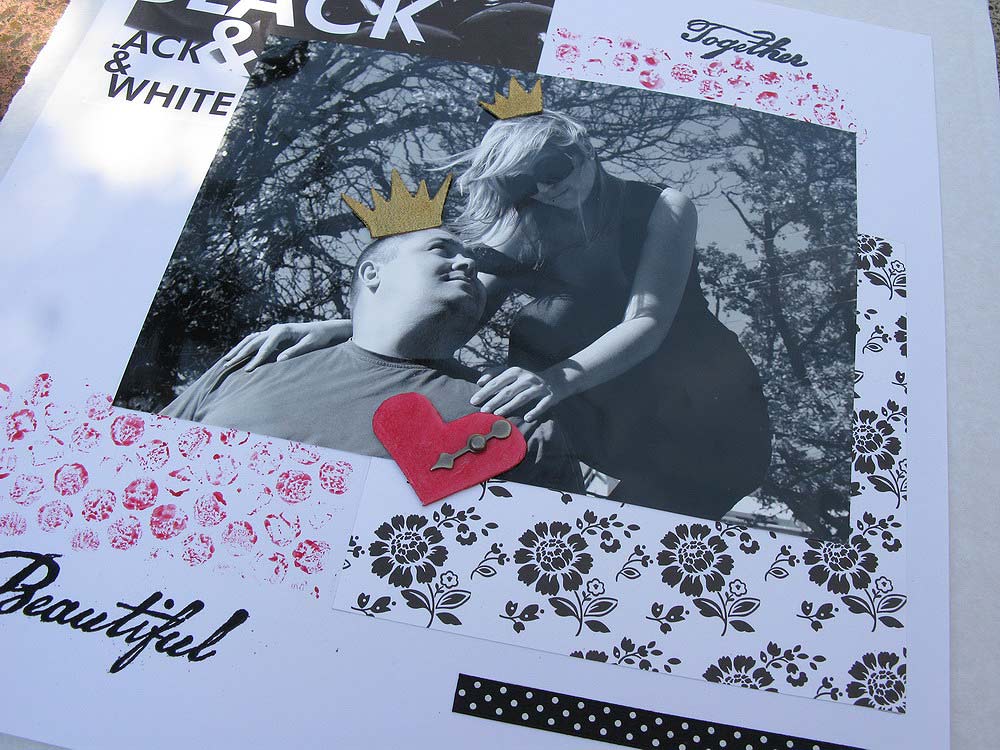 Теперь про материалы. Размер 30×30. Для основы взят картон белого цвета, подложки под фото — два кусочка с черно-белым принтом. Из украшений: короны - горячий эмбоссинг золотой пудрой, надписи — тоже эмбоссинг черной пудрой, сердце вырезала из картона, покрасила акварельной краской, щедро покрыла глосси акцентом и проткнула стрелкой от Тима Хольца, штампинг пластиковыми бульбашками ( не знаю как это правильно называется) , которые покрывала той же акварельной краской, кусочек ленточки в горошек