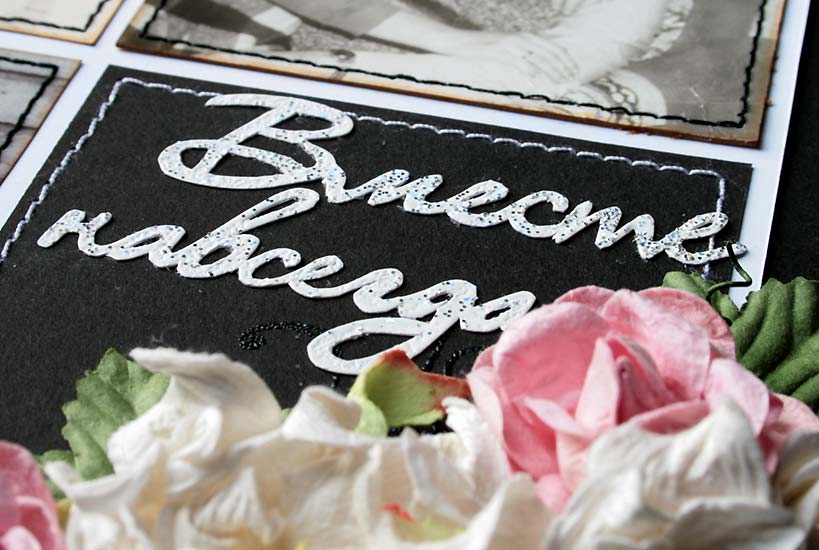 На основе, в двух противоположных по диагонали углах сделала эмбосинг белой пудрой с блестками. Использовала штампы с завитушками. После приклеила подложку с уже пришитыми фото к основе. По краю отстрочила пустые уголки. И украсила цветами. Розы и гардении