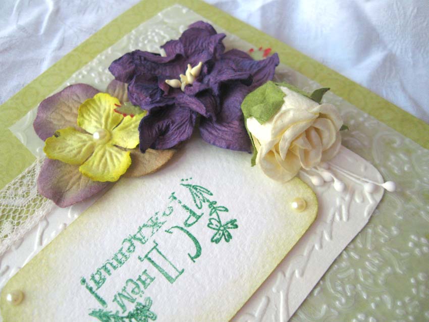Украшала тисненными бумажками, цветами Prima и гарденией, тычинками и половинками жемчужин