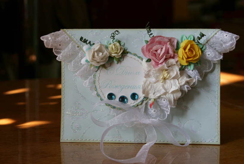 Первый сделан из половинки одного листа двусторонней бумаги из этого набора. Украшен кружевом и множеством цветов, завязывается ленточкой из органзы. Надпись сделана с помощью штампа, надпись на котором раньше была в одну строчку, но я его разрезала и теперь делаю ее в две строчки)) если требуется. Несколько стразин пристроились под надписью. А весь конверт по контурам рисунка я покрыла глитером, и он стал очччень красиво блестеть и переливаться на солнышке. Следующий конверт из одностороннего листа Websters Pages. Украшен эмбосингом, опять же цветами и лентой и бумажным кружевом, сделанным, любимым многими дыроколом Martha Stewart — Doily Lace Edge.