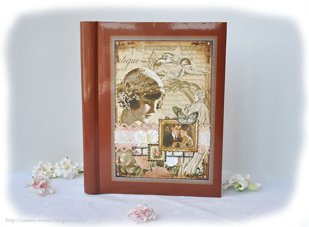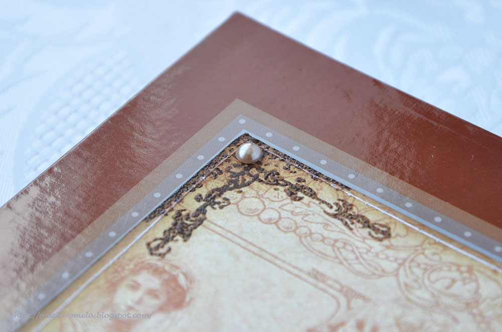 Пленка Тима Хольтца пристрочена на машинке, по уголкам штамп-уголок Тима Хольтца, запечен с использованием прозрачной пудры для эмбосинга Stewart Superior Cloisson Ultra-Thick Embossing Powders — clear. Украшен половинками жемчугаАльбом получился в винтажном стиле.