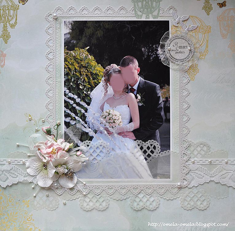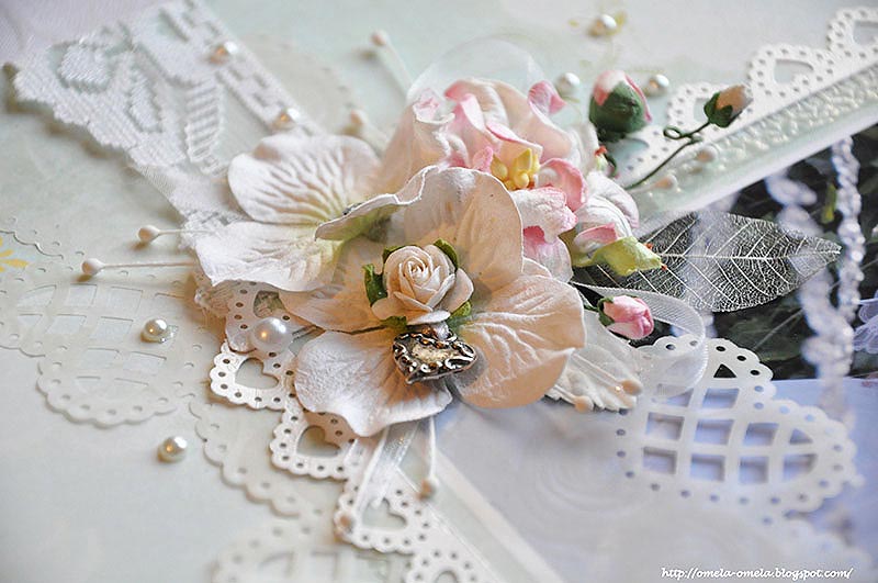 Вот здесь хорошо видно, что самым большим дыроколом я обработала края полоски очень красивого веллума с изображением роз. Веллум я наложила поверх фотографии. По краю фото выштамповала рамочку из растительного бордюрчика, посыпала прозрачной пудрой для эмбосинга для мелких деталей Ranger «Super Fine Detail» — Clear и заплавила.