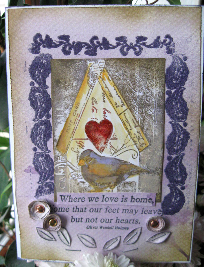 Фон сделан на акварельной бумаге дистрессинговыми чернилами, штамп тоже. Хочу немного рассказать , как я делала отштамповку. Я на саму поверхность штампа нанесла несколько цветов чернил и поставила оттиск на бумаге, а потом дополнительно раскрашивала птицу и крышу скворешника. Вокруг картинки эмбоссинг фиолетовой пудрой