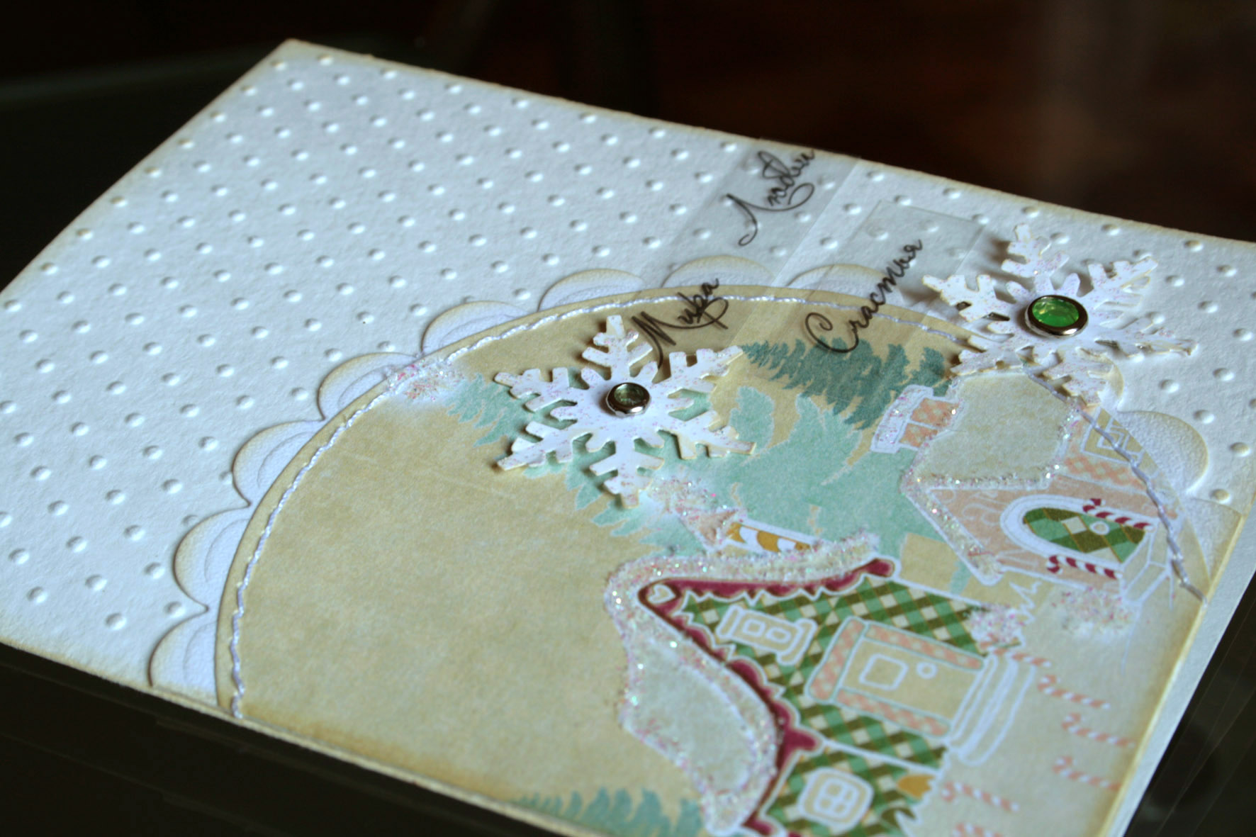 Следующая открыточка притягивает своей нежностью. В ее основе белая бумага для акварели, тисненная такой папочкой. Из бумаги я вырезала круговой элемент с рисунком, сделала подложку. Сострочила их по краю. Крыши домов покрыла глосси акцентом и щедро посыпала каким-то сыпучим глитером, оставшимся от дочкиных поделок. Картинка сразу замерцала и запереливалась.