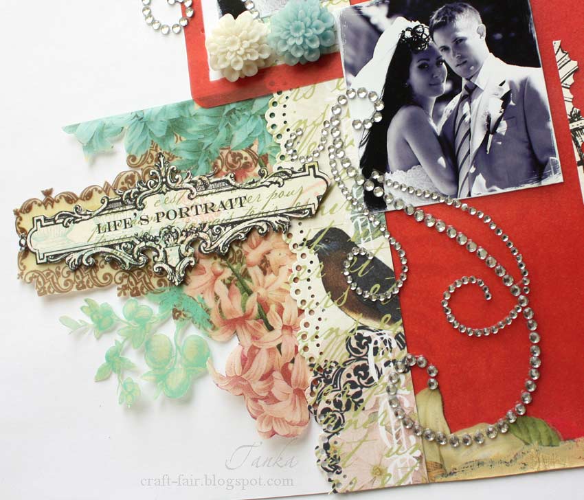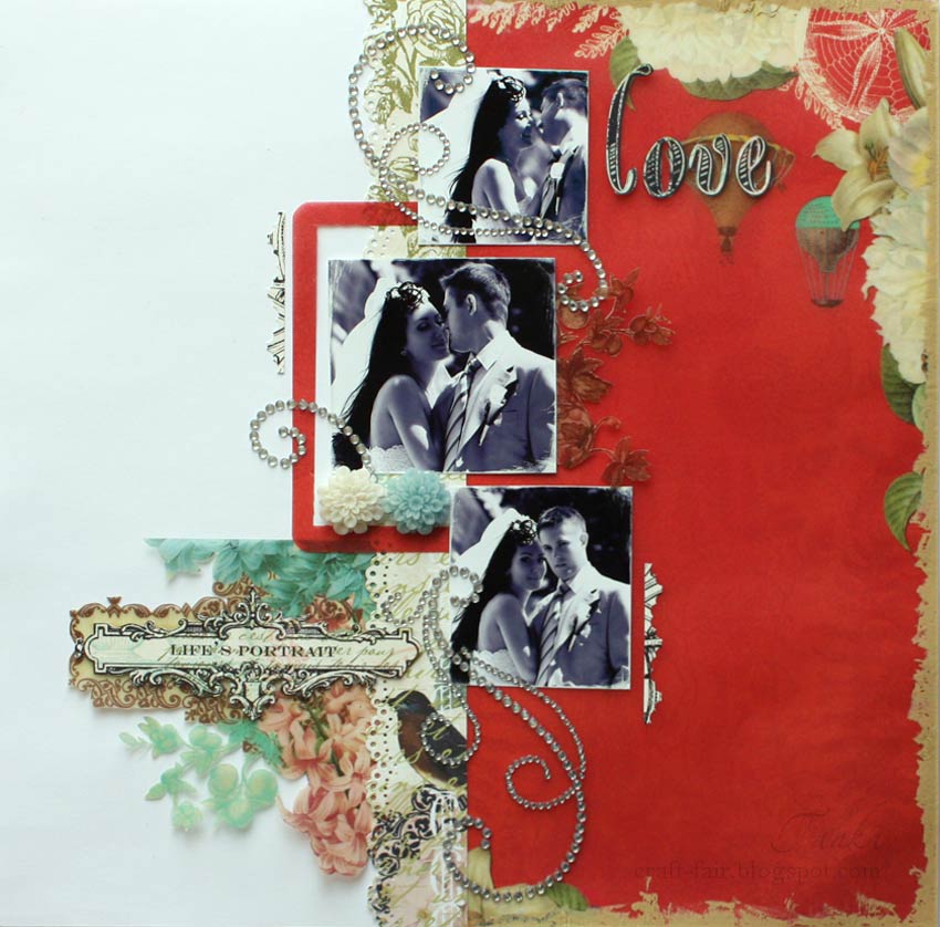 Я редко скраплю свадебные фото, точнее это только вторая страничка. Не могла подобрать под такой насыщенный красный цвет дочину фотографию. Поэтому обратилась к нашему свадебному альбому. И думаю, это был правильный выбор :) Лист веллума Webster's Pages разрезала пополам и наклеила на белый лист 30×30 см. Украшения и надпись тоже вырезаны из бумаги Webster's Pages. Вообще украшений, как видите, немного, но страничка, мне кажется, от этого только выигрывает :) Фото, естественно, выбрала ч/б, цветные бы терялись на этой бумаге в таком скетче.