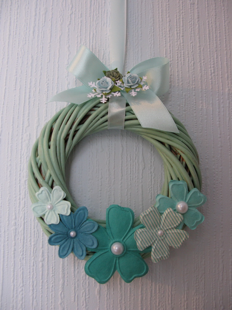 В серединки приклеила половинки жемчужин , сами цветы приклеила с помощью клеевого пистолета ( очень полезная штука оказалась!) Ну вот венок и готов!