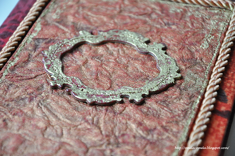 В основе — готовый ежедневник. Обложку я отделила и обтянула тканью. Но прежде пришила декор, в качестве которого выступала очень плотная жатая декоративная бумага, больше похожая на холст, покрытый краской. Подвернув поля, я пристрочила бумагу к ткани. Затем вручную пришила потрясающе красивую рамочку из набора Высечек с тиснением Tattered Angels «Framed fonts» 3-in-1 Alpha chips. Накануне Нового года мне все-таки удалось заполучить наборчик таких высечек, чему я несказанно рада!