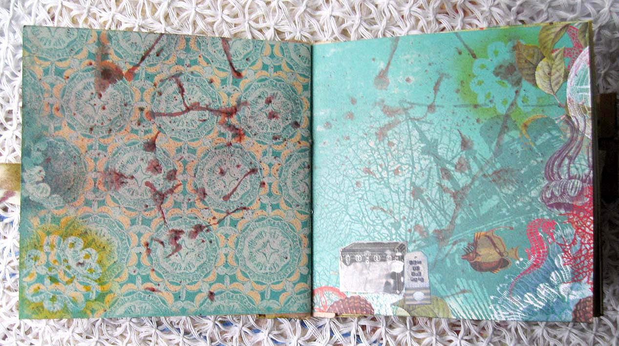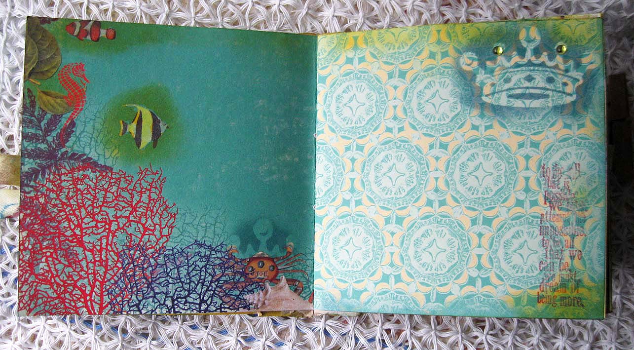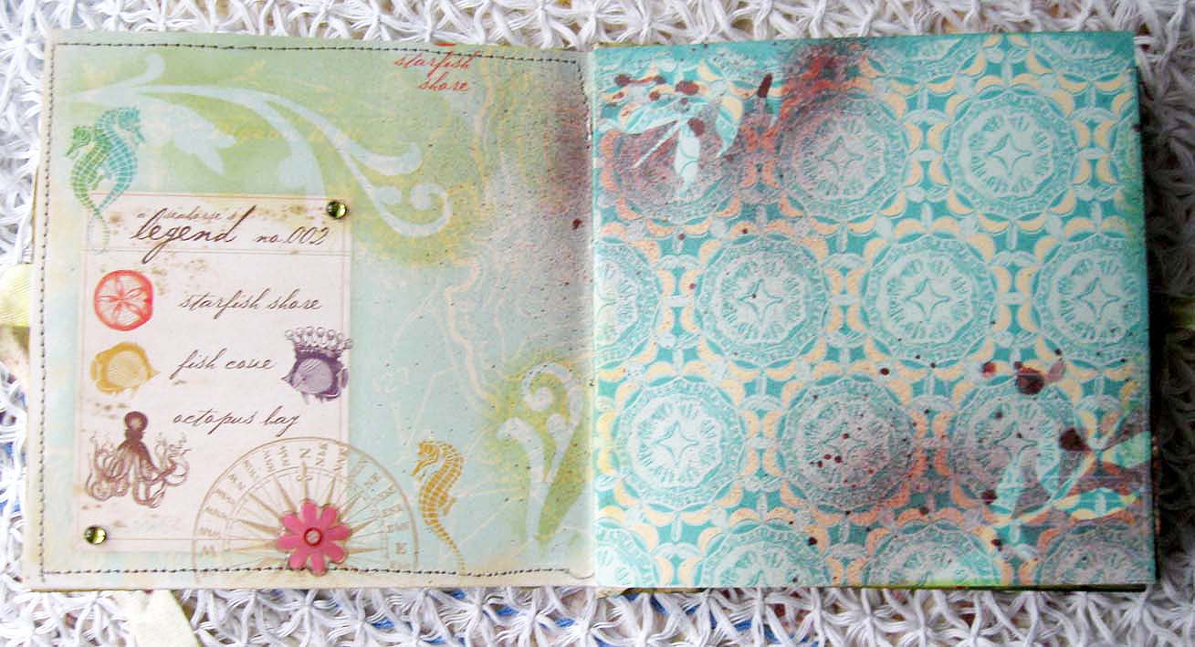 Некоторые детали рисунка бумаги покрывала прозрачной пудрой для эмбоссинга, цветы и рыбки) использовала натирки