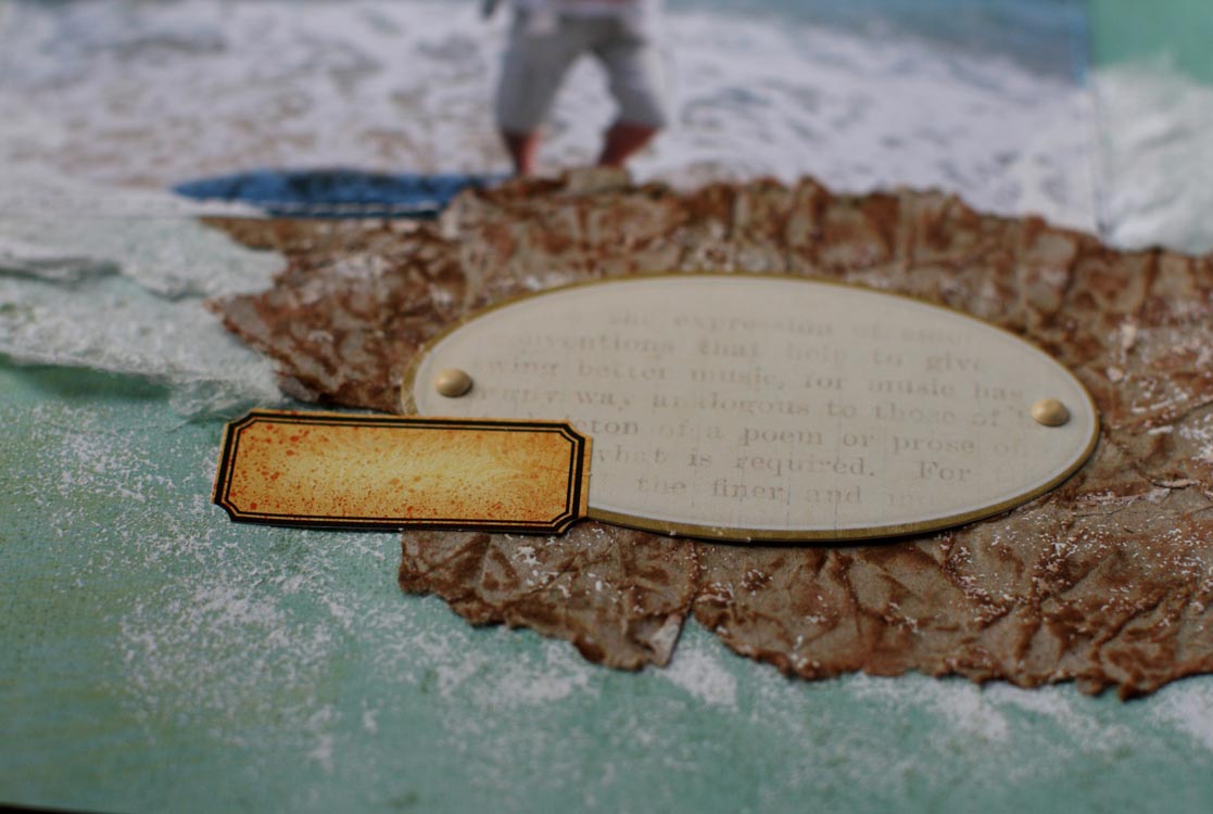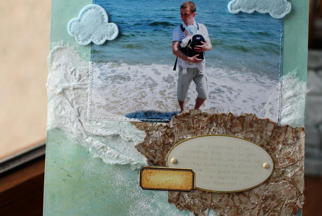И после, попыталась из крафт бумаги сделать нечто похожее на морской песочек и гальку. Для этого помяла бумагу, расправила и нанесла несколько цветов дистресс чернил, сбрызнула все водой и высушила феном. Приклеила на страничку и сверху немного прошлась губкой с акриловой краской. На этом этапе осталась довольна результатом и остановилась)))