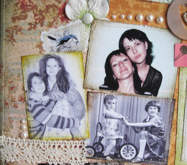 В левом верхнем углу собрала наши с сестрой фотографии, где мы вместе. На самом деле детская фотография одна из немногих, да и в подростковом возрасте тоже, это уже сейчас мы с ней часто фотографруемся) Украсила половинками жемчужинок, кружевом, цветком гортензии Petaloo «Mulberry street» и маркой с птицей