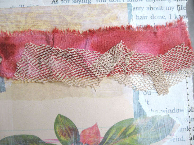 Хочу показать еще ленты,которые я использовала, одну нарезала из крашеной в чае тюли, а вторую из ситца, рвала на полоски и красила дистресинговыми чернилами Distress Ink — fired brick