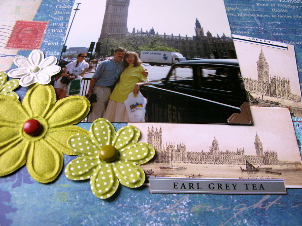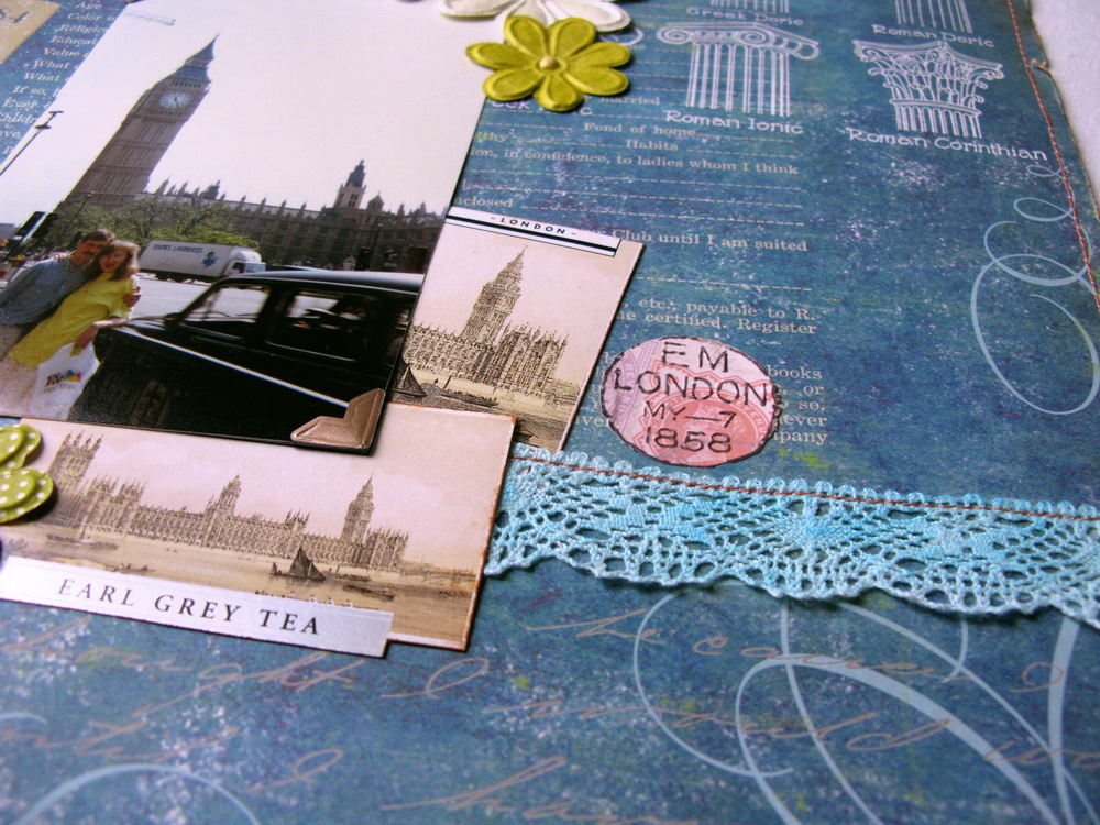 Здравствуйте, дорогие читатели блога! Наверняка многие из вас уже заняты подготовкой к светлому празднику, я тоже, но у нас последние дни такие дождливые, что мытье окон я решила отложить и наконец-то взялась за давно задуманный альбом про путешествия. Сегодня я покажу вам свою первую страничку. Сложилась она быстро и легко. Когда я увидела лист бумаги 7Gypsies , я сразу себе представила страничку с одной из фотографий , сделанных в Лондоне.
