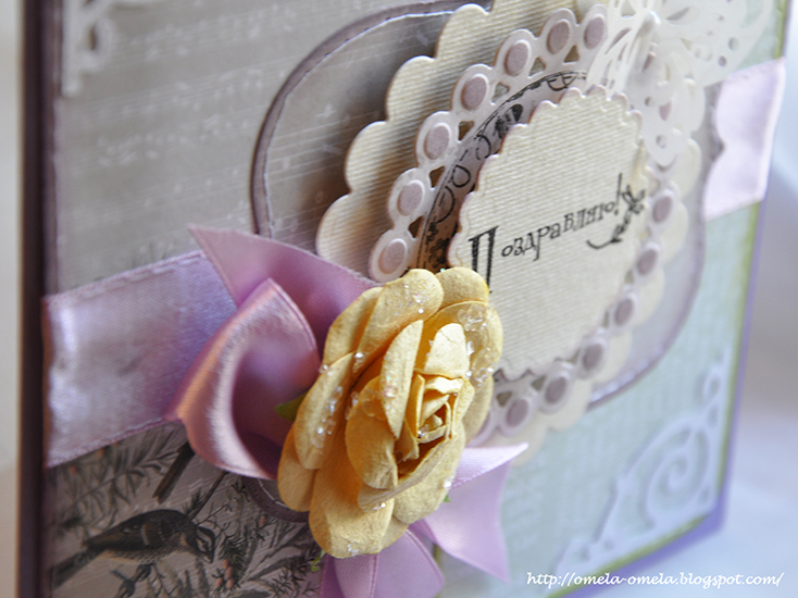 Собраны высечки на вспененный скотч. Украшений в открытке я использовала немного, так как они крупные — это высечка бабочки, сделанная дыроколом McGill «Silhouette» — Butterfly punch и большая бумажная роза контрастного бумаге желтого цвета.