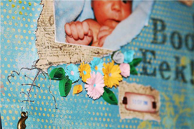 Размер страницы 25×25 см,основная бумага из данного набора, подложка — офисная бумага тонированная черным чаем с наштампованым фоном, для квиллинговых цветочков использовала бумагу для оригами, чернила для фона, набор для штампинга ColorBox «Misty Meadow», штампы алфавит 2-х видов, глиттер, ленту в горошек, брадс пуговичка из набора брадсов Sabrina. Края фото состарены при помощи пилочки для ногтей!