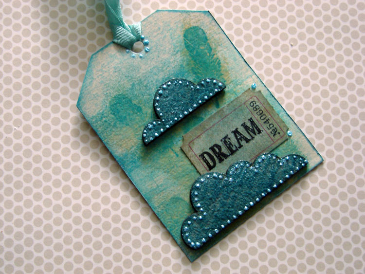 Деталь: облака покрыты прозрачной пудрой для эмбоссинга и тонированы серебряными чернилами.