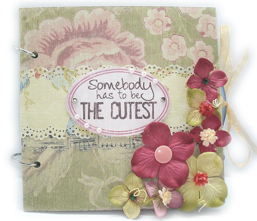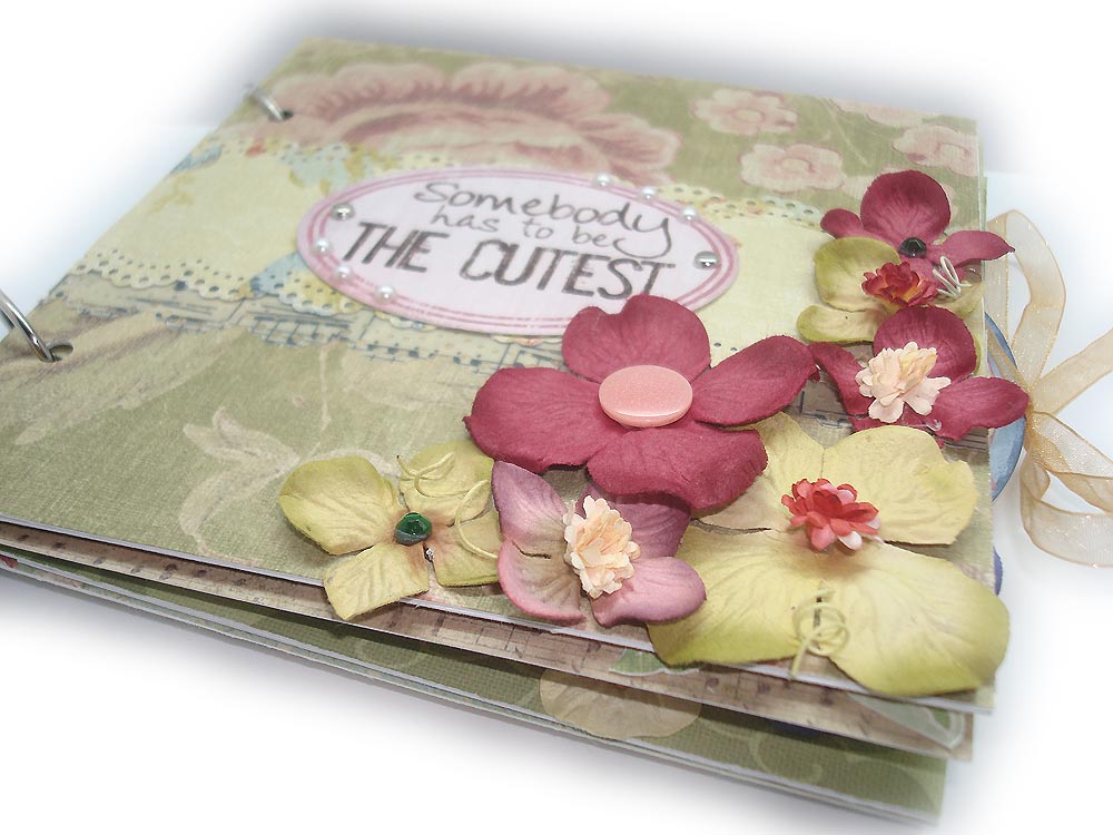 Для создания альбома была использована бумага K&Company из разных наборов, натирки, цветы Prima, высечки, пуговицы и различные дырокольные элементы.