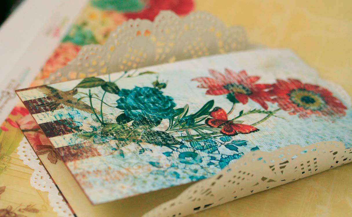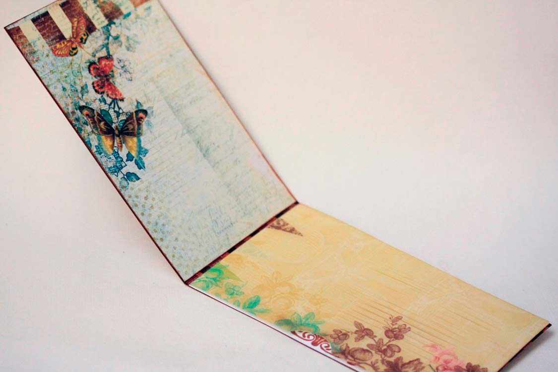У меня рисунок с цветами и бабочками очень удачно вписался в нужный размер, так что в дальнейшем лицевую сторону я даже не украшала.