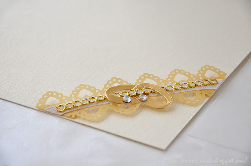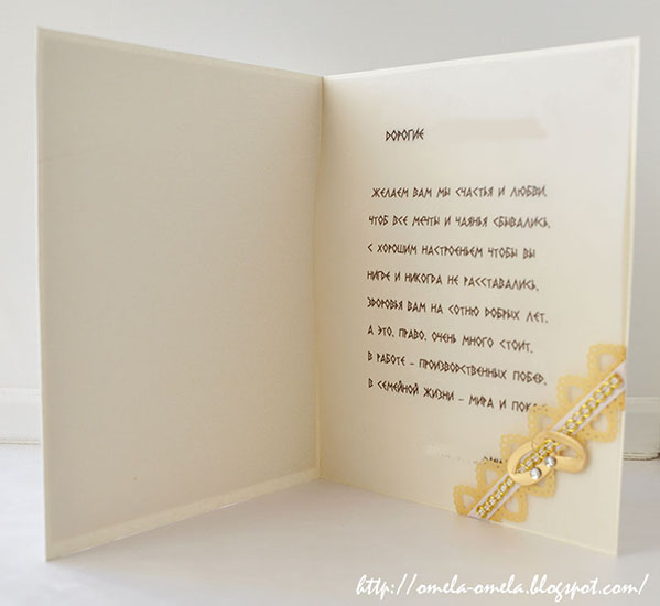 Внутри уголок, который держит кальку. Сделан при помощи бордюрного дырокола Martha Stewart , украшен лентами, высечкой и стразами.