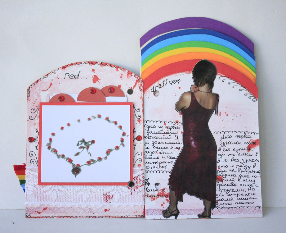 Красный разворот. На правой странице – моя фотография, вырезанная по контуру (все как надо: красное платье, красный маникюр и бижутерия, алая помада), обведенная черным линером. Много журналинга и дудлинга.