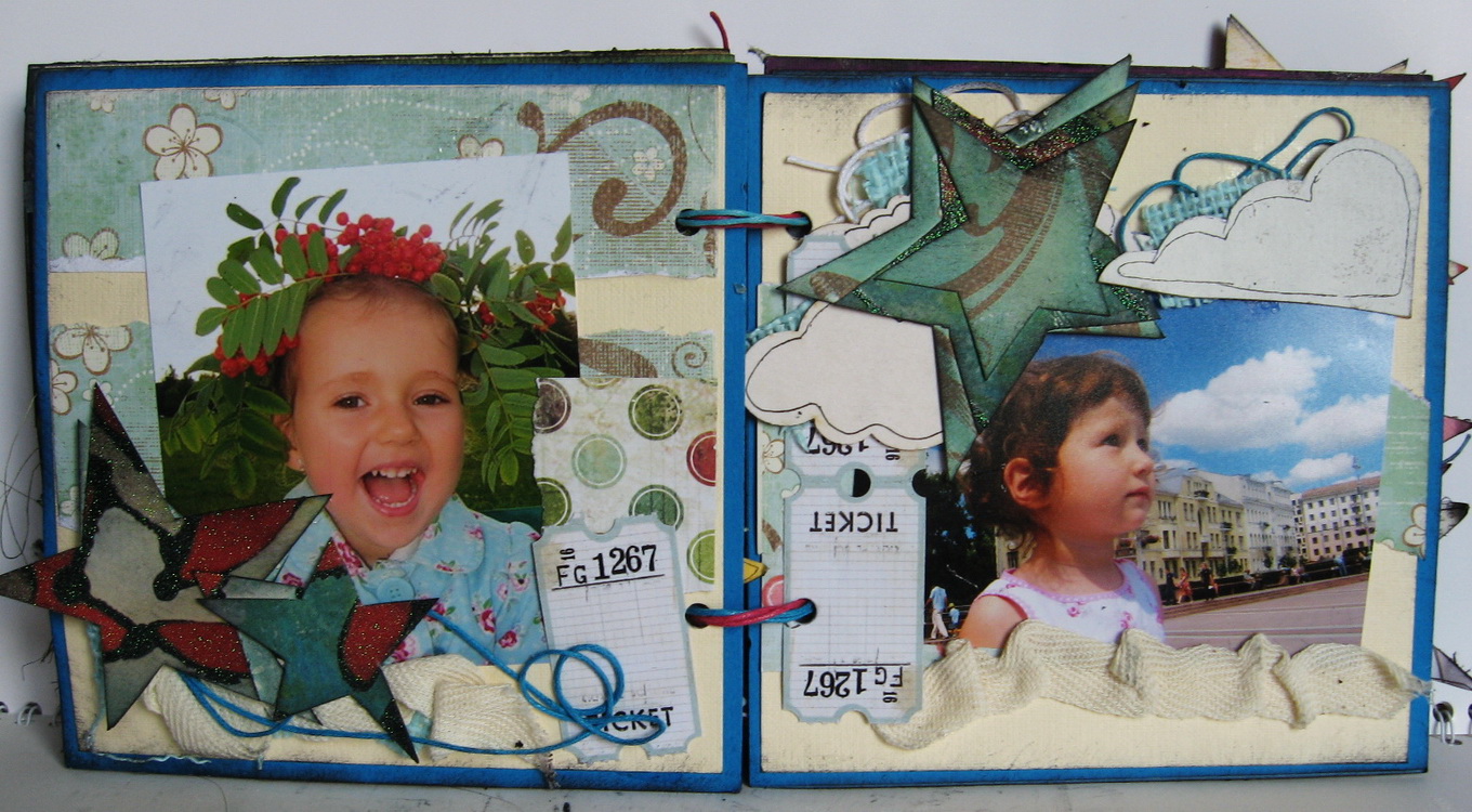 Голубые странички- текстиль. Облака изначально были и марлевые, и льняные, в конце концов деревянные, подложка под облаками-лен, вощёный шнур, киперная лента.Что для меня голубой цвет? Это прежде всего- чистое небо над моими детьми, это — счастье,это - голубые глаза моей Алёнки, это - мой любимый цвет!