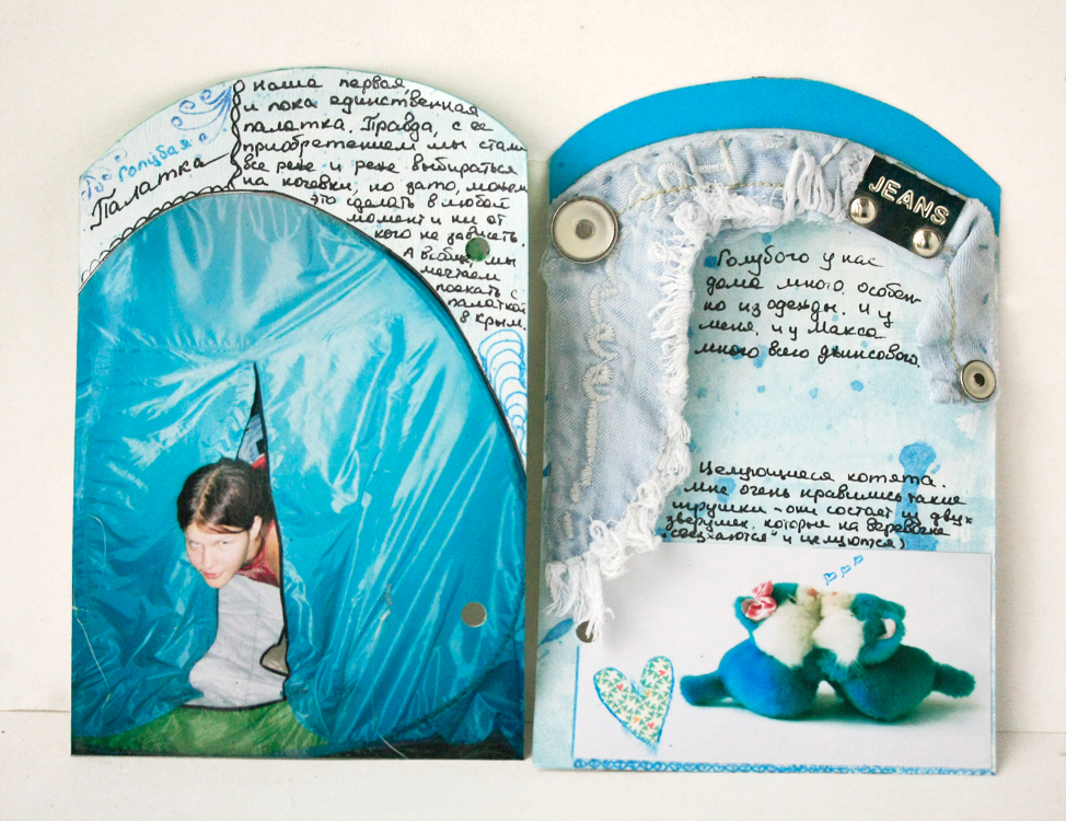 В этом развороте я использовала кусочек кармана от моих старых джинс. Ведь именно с ними, в первую очередь, у меня ассоциируется голубой цвет. Из большой фотографии вырезала палатку, из которой выглядываю я. Сердечко на фото с котиками – натирка.