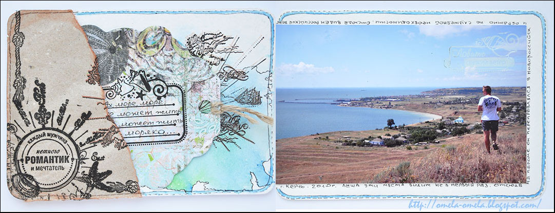 Синий разворот посвящен мужу, который по роду своей профессии связан с морем. Секретиком является пристроченный кармашек из крафт-бумаги, под который прячется тэг с журналингом.