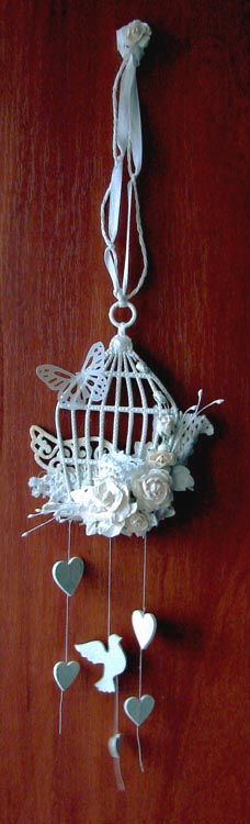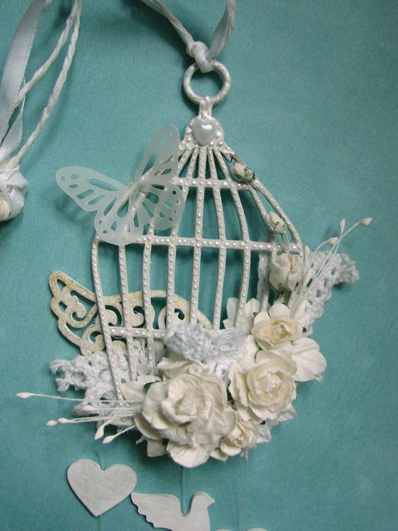 Самое интересное здесь, конечно же, клетка. Она покрашена белым акрилом, при помощи жидкого жемчуга сделаны акценты, фигурное крылышко также покрашено белой краской и покрыто белым клеевым глиттером, бумажные розы, кружево, тычинки, белые цветки пуансеттии, жемчужинка-сердечко и бабочка из велллума:
