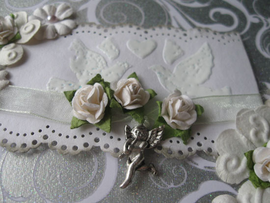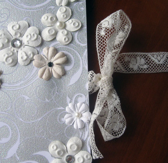 Когда в качестве обложки используется красивенная бумага с тиснением и глитером, украсить ее почти невозможно, но я очень старалась))) Цветы Prima «E.Line» — Chelsea white и половинок жемчужин и страз «Prima» — Platinum, в центре голуби — это тиснение по трафарету, а сверху горячий эмбоссинг пудрой для эмбоссинга Stewart Superior Cloisson Ultra-Thick Embossing Powders